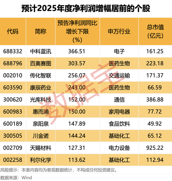 从预告净利润同比增幅下限来看,中科蓝讯、百奥赛图、传化智联、康辰药业4股预告净利润同比增幅居前,均超过200%。