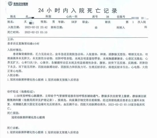 2023年2月23日,58岁的关先生因“冠状动脉粥样硬化性心脏病”死于广东省东莞市康华医院。