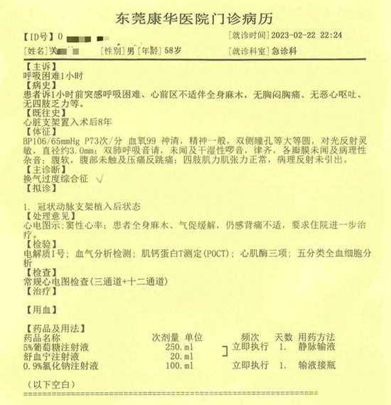 东莞康华医院病历显示,关先生因胸背痛持续,乏力无法站立,送急诊科。晚11时41分,转入,23日凌晨0时3分,医生阳某下医嘱,心内科护理常规、一级护理,留陪护一人。医生阳某对其诊断为“冠状动脉粥样硬化性心脏病”“冠状动脉支架植入后状态”。