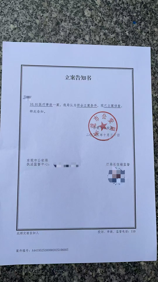 2025年10月1日,王女士向东莞市公安局南城分局报警。10月30日,警方就“医疗事故”一案,立案侦查。