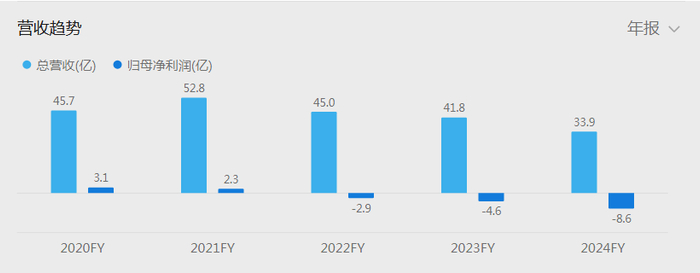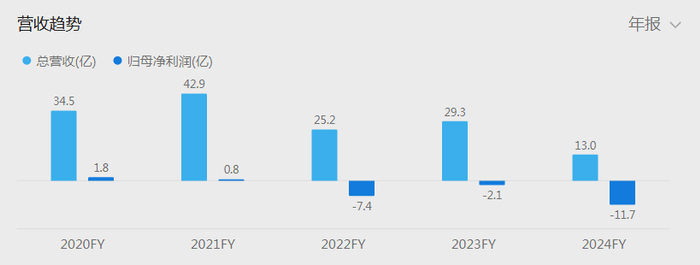 进入2024年,情况没有好转。财务数据显示,2024年公司营业收入12.96亿元,同比大幅下降55.84%;归母净利润亏损进一步扩大至11.71亿元。2025年前三季度经营状况未见好转,实现营业收入5.44亿元,同比下降52.02%,归母净利润亏损0.58亿元。