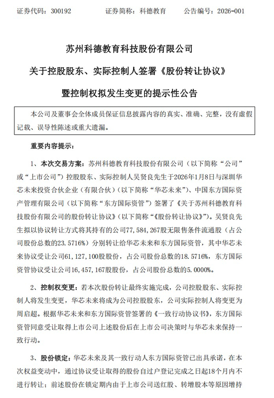 1月8日晚间,科德教育(300192)发布公告,公司控股股东、实际控制人吴贤良与深圳华芯未来投资合伙企业(有限合伙)(简称“华芯未来”)及中国东方国际资产管理有限公司(简称“东方国际资管”)签署《股份转让协议》,公司控制权将发生变更。