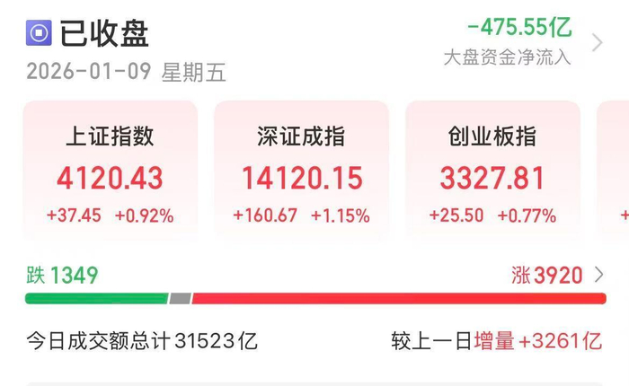 截至收盘,沪指报4120.43点,涨0.92%;深证成指报14120.15点,涨1.15%;创指报3327.81点,涨0.77%。沪深两市成交额3.12万亿,较上一个交易日放量3261亿,时隔73个交易日后再度站上3万亿大关,历史第五次突破3万亿。