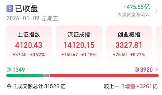 1月9日,A股震荡走强,市场放量显著。截至收盘,上证指数涨0.92%,站上4100点,创逾10年新高;深证成指涨1.15%,创业板指涨0.77%。