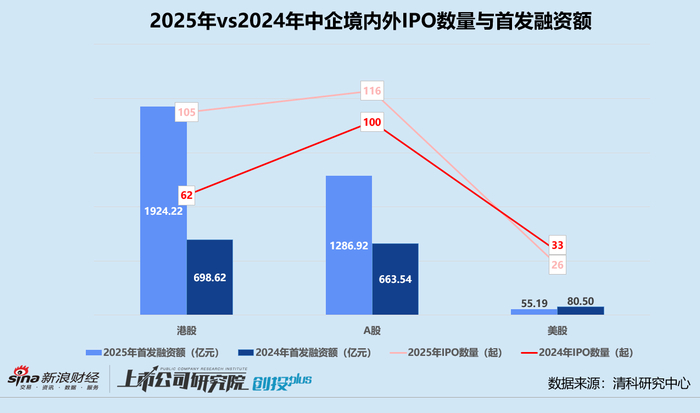清科研究中心数据统计,2025年境内外共有247家中企上市,同比增长26.7%,首发融资额约合3266.32亿元,同比增长126.4%。其中,下半年共有138家中企上市,首发融资额约合2052.72亿元,约占两项指标55.9%、62.8%。