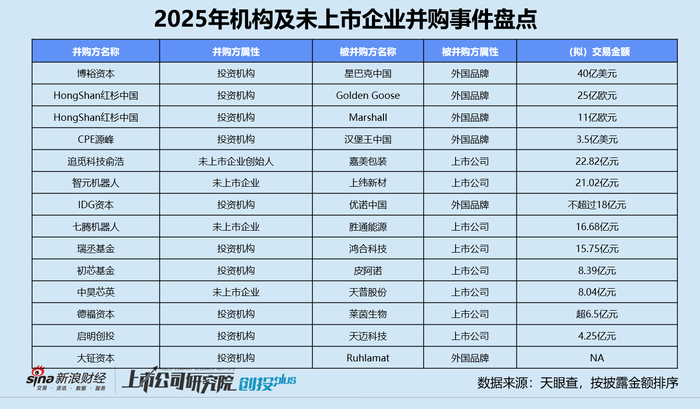 其二是投资机构或独角兽企业并购上市公司。启明创投斥资4.25亿元收购智能公共交通解决方案提供商「天迈科技」,不仅意味着国内股权投资机构首次以并购方式深度介入上市公司,更标志着传统成长型基金开始系统性进入并购赛道。随后,初芯基金以8.39亿元入主定制家居企业「皮阿诺」,目标持股29.99%;德福资本收购甜味剂公司「莱茵生物」,并将核心资产食品营养强化剂企业「金康普」注入上市公司;奇瑞集团旗下的CVC机构瑞丞基金凭借15.75亿元,一跃成为教育科技公司「鸿合科技」的控股股东。