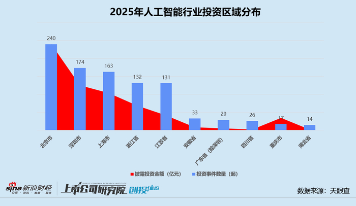就投资区域而言,位于北京市的人工智能公司获投数量和金额双双夺冠。2025年,共有171家北京企业完成240起投资,同比分别增长51.3%、72.7%,披露总投资额约为241.07亿元,与2024年基本相当。四川、海南、河南和香港投资事件数量虽然增加,但披露投资金额同比呈下降趋势。陕西和天津“量价齐跌”,在热门赛道表现后继乏力。此外,河北、广西、黑龙江、吉林、辽宁、江西和新疆实现了零的突破,均有1-2家人工智能企业获得融资。
