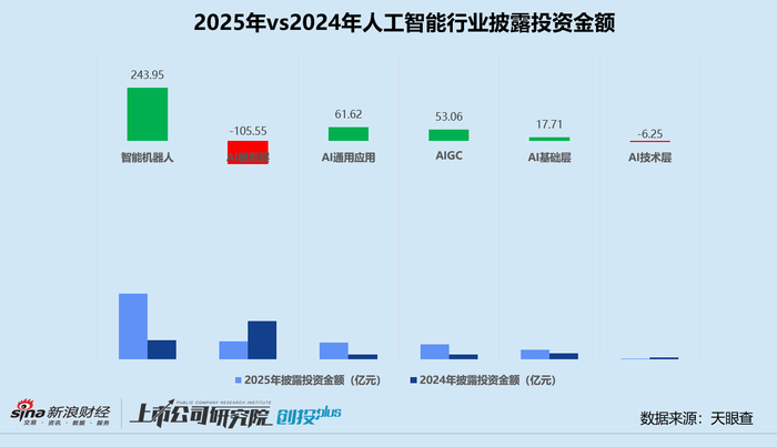 就细分领域而言,智能机器人2025年备受追捧。统计区间内,智能机器人公司共完成530起投资,合计披露金额344.65亿元,较2024年大幅增长116.3%、242.2%。两项指标约占人工智能行业投资事件数和金额的52.2%、52.5%,分别对比2024年提高近8个百分点、27个百分点。