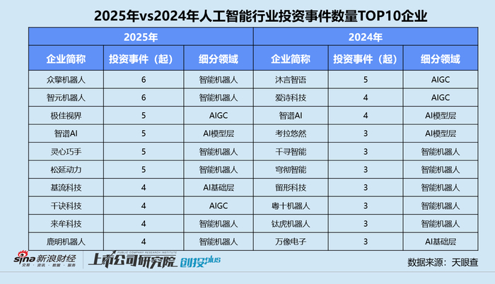 与此同时,单轮融资规模在10亿元以上的人工智能公司显著增加。2025年,共有6家公司融资额超过10亿元,多模态大模型通用机器人研发商「银河通用机器人」B轮和B+轮融资分别为11亿元人民币、3亿美元,短短半年内累计融资超32亿元。而2024年,获得逾10亿元融资的人工智能公司只有3家,基础大模型Kimi研发商「月之暗面」先后完成超10亿美元A轮融资和超3亿美元B轮融资,Hongshan红杉中国、高榕创投、小红书、阿里巴巴、美团战略投资部、腾讯投资、三七互娱创投基金等知名机构跻身股东之列。