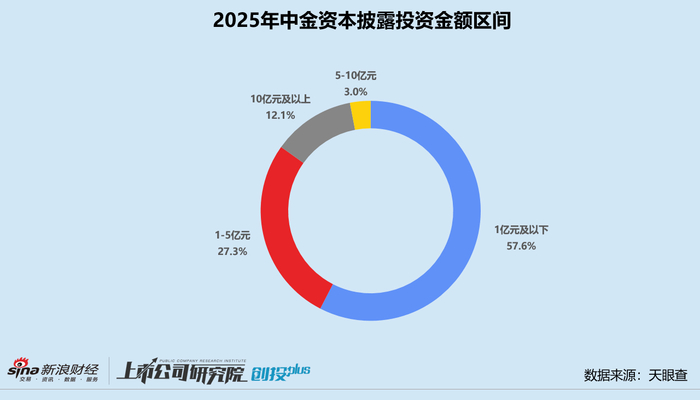 从参投事件的金额区间来看,中金资本主要参与1亿元及以下和1亿元-5亿元规模的投资。若剔除未披露投资额的事件,两个区间投资事件数分别占比57.6%、27.3%。10亿元以上的大额融资共4起,参投规模最高的项目是具身多模态大模型通用机器人研发商「银河通用机器人」,中金资本与中科院基金、苏创投、央视融媒体基金、天奇股份等机构联合出资超3亿美元,刷新具身智能领域单轮最高融资额,公司投后估值高达30亿美元。