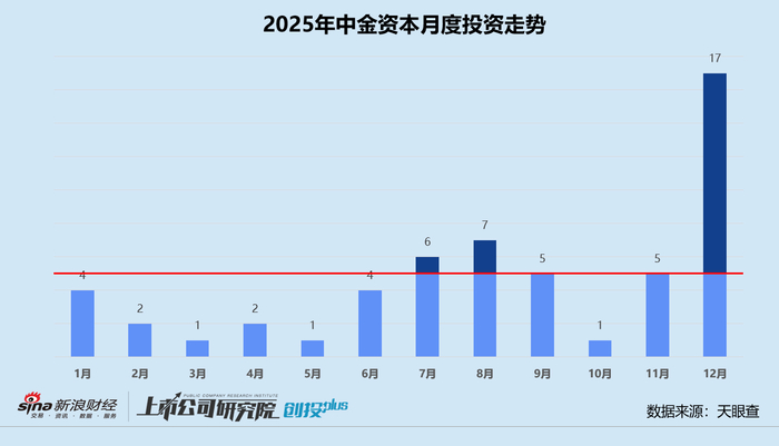 统计区间内,中金资本公开披露的股权融资事件共55起。一季度和二季度的投资节奏相对谨慎,各仅完成7起。下半年随着环境趋稳、利率走低以及创新浪潮驱动,中金资本更为乐观,三季度与四季度分别完成18起、23起投资事件,12月完成17起,约占四季度投资事件总数73.9%。