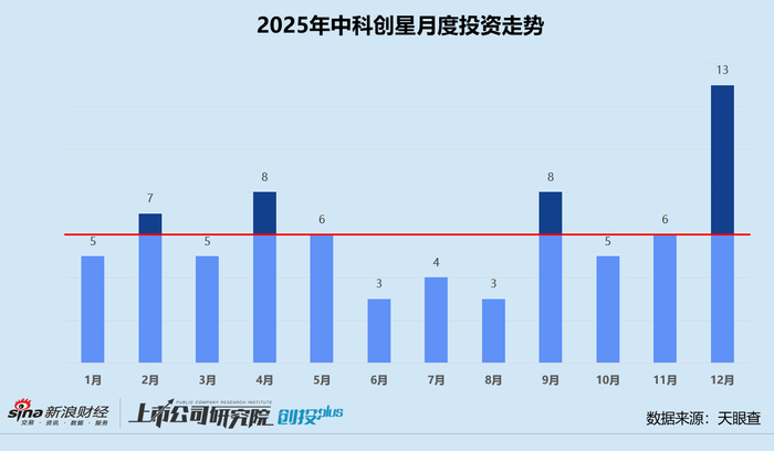 统计区间内,中科创星的投资节奏相对平稳,1-3季度平均投资事件数保持在15起上下,年末大幅提升至24起。12月,其共完成13起投资事件,约占当季投资总量的54.7%。