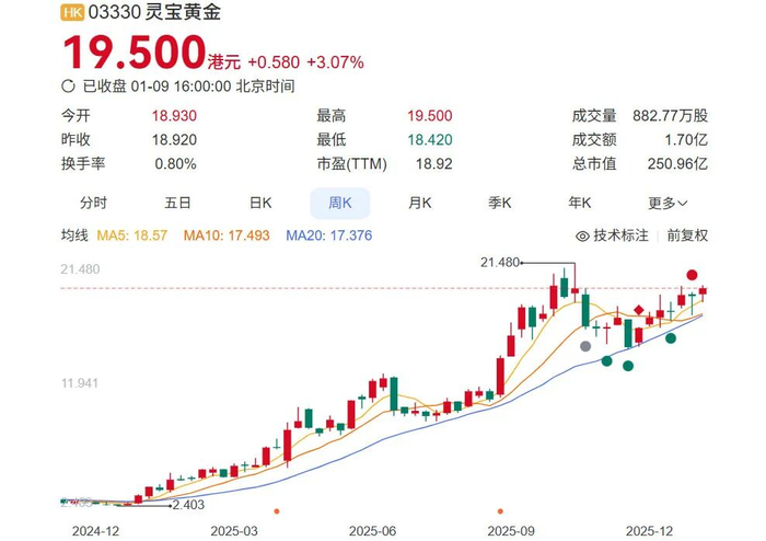 1月8日,灵宝黄金公告盈喜,预计2025年净利超15亿元,上涨至少1倍,一年入账近130亿元。