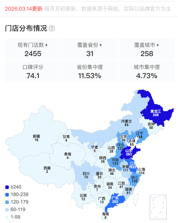 窄门餐眼数据显示,截至3月14日,刘文祥麻辣烫全国在营门店数为2455家,覆盖31个省份,其中山东店数最多,超280家,此外,黑龙江有248家,上海有116家,北京有96家。以目前的规模,刘文祥麻辣烫已经稳坐国内麻辣烫赛道的第三把交椅,仅次于杨国福麻辣烫与张亮麻辣烫,后者门店数均在5700家以上